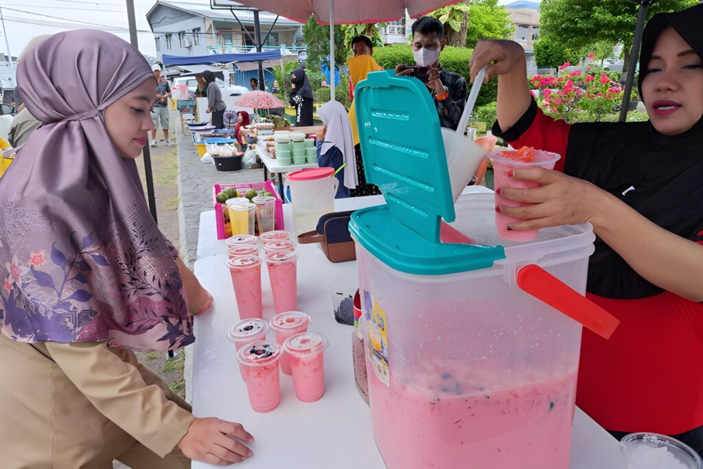 Ilustrasi - Seorang pedagang minuman menyiapkan pesanan Bupati Nunukan Asmin Laura (kiri) di salah satu area jualan UMKM di Kota Nunukan, Kabupaten Nunukan. IST/Pemkab Nunukan