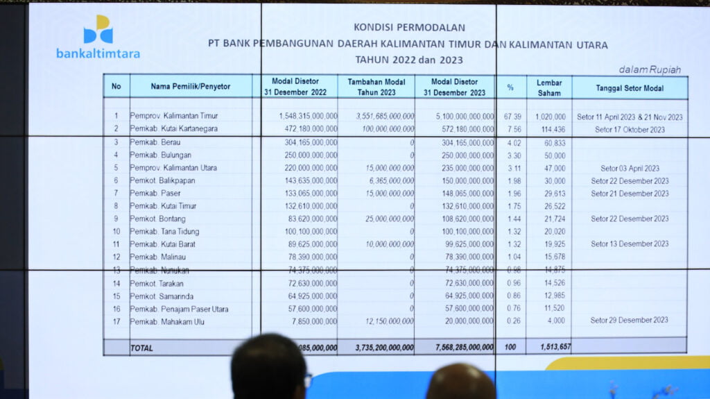 Permodalan Bankaltimtara sampai 31 Desember 2023 sebesar Rp7,5 triliun ditopang oleh penyertaan modal 17 Pemerintah Daerah yakni dua pemerintah provinsi (Pemprov) yaitu Pemprov Kalimantan Timur Rp5,1 triliun) dan Pemprov Kalimantan Utara rp235 miliar.