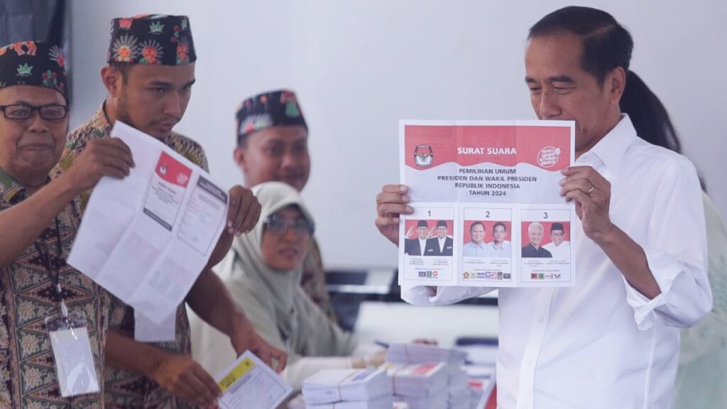 Jokowi menyalurkan hak pilihnya di TPS 10, Gedung Lembaga Administrasi Negara (LAN) RI, Gambir, Jakarta Pusat, pada Rabu (14/2/2024).
