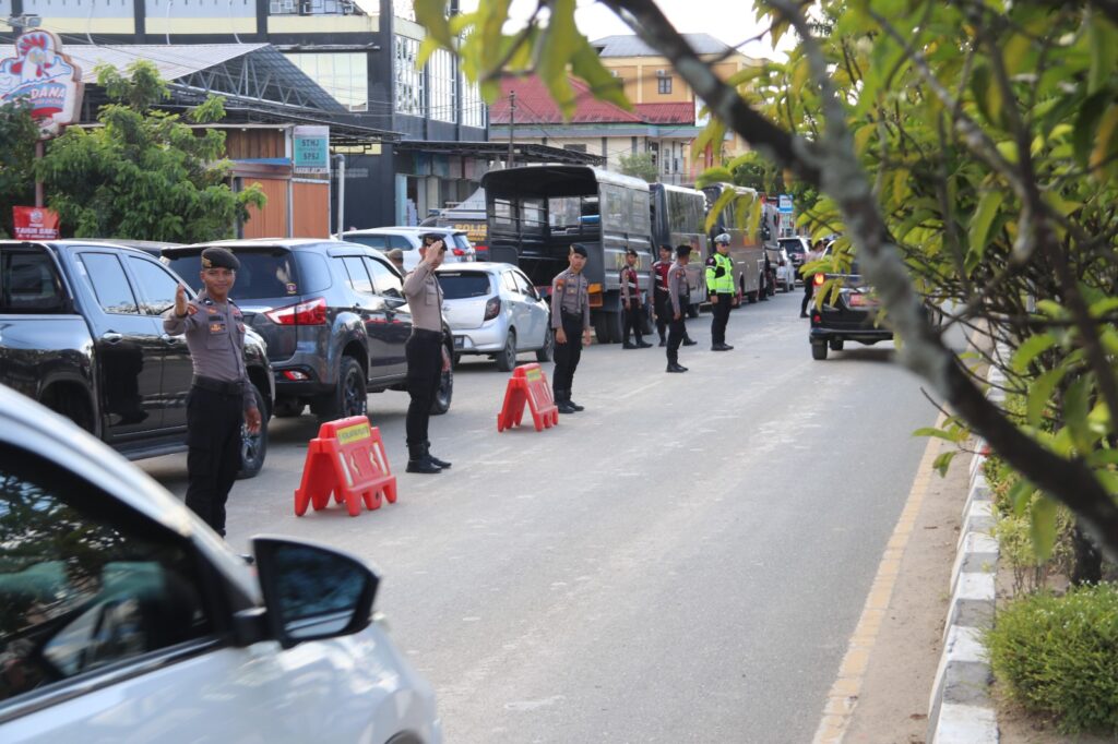 Personel Polda Kaltara berjaga dan mengatur lalu lintas di sekitar kantor KPU Kaltara di Jalan Sengkawit Tanjung Selor, Kamis (9/1/2025). BIDHUMAS