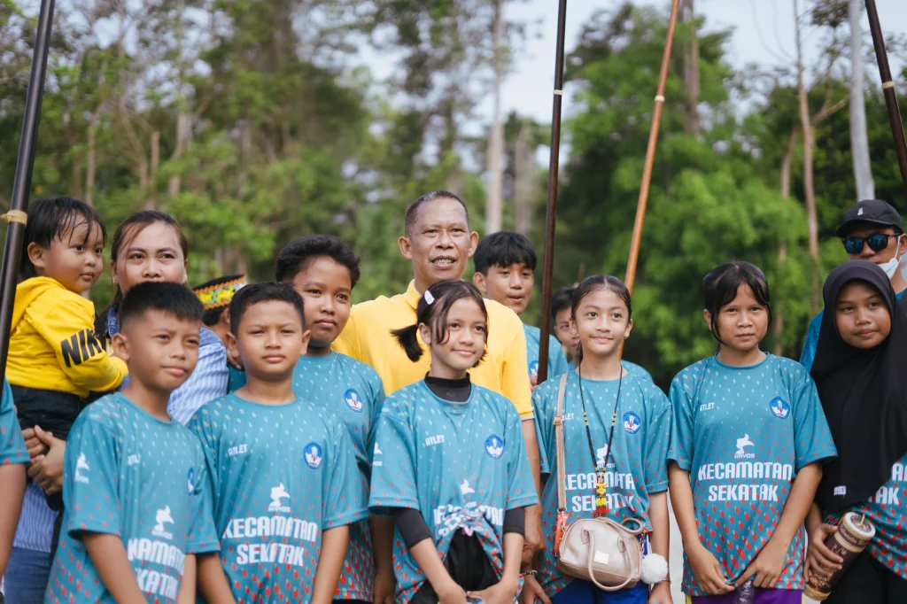 Bupati Bulungan, Syarwani (tengah berkaus kuning), berfoto bersama para atlet pelajar kontingen Kecamatan Sekatak dalam acara pembukaan Kompetisi Olahraga Tradisional Pekan Kebudayaan Daerah (PKD) Bulungan 2026 di Kebun Raya Bundayati, Tanjung Selor, Sabtu (18/4/2026). IST